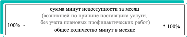 - сумма минут недоступности в месяц (возникшей по причине поставщика услуги и без учета плановых профилактических работ),
